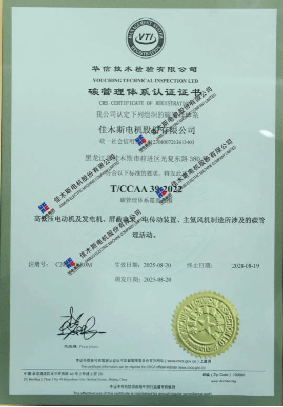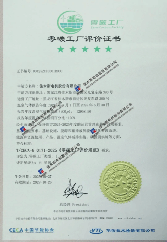 10月27日,華信技術(shù)檢驗有限公司在哈電集團佳木斯電機股份有限公司(以下簡稱“佳電股份”)舉行零碳工廠暨碳管理體系認(rèn)證頒證儀式,佳電股份獲評《碳管理體系認(rèn)證證書》與《零碳工廠評價證書》,成為國內(nèi)電機行業(yè)首家通過《零碳工廠評價規(guī)范》新標(biāo)準(zhǔn)認(rèn)證的企業(yè),標(biāo)志著佳電股份在高端化、智能化、綠色化發(fā)展道路上邁出的關(guān)鍵一步。
